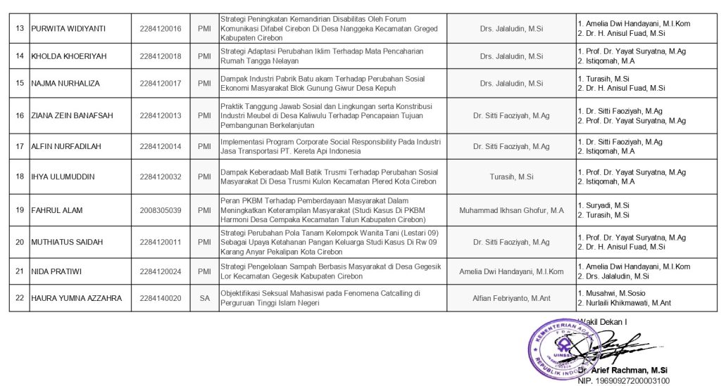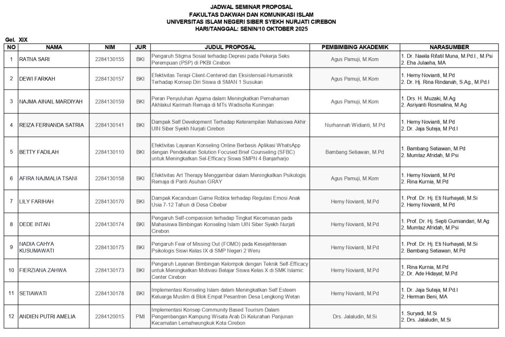 Berikut kami sampaikan jadwal Ujian Seminar Proposal Gelombang XIX Tahun 2025 yang akan dilaksanakan pada hari Senin tanggal 10 November 2025 dan ujian akan diselenggarakan secara Tatap Muka di Ruang Sidang Fakultas Dakwah dan Komunikasi Islam Ruang 203 lantai 2. Adapun waktu pelaksanaan disesuaikan dengan keluangan waktu dari Dosen Penguji. Kepada peserta ujian harap dipersiapkan sebaik mungkin. Selamat Berjuang Semoga Sukses…