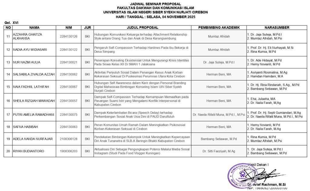 Berikut kami sampaikan jadwal Ujian Seminar Proposal Gelombang XVI Tahun 2025 yang akan dilaksanakan pada hari Selasa tanggal 04 November 2025 dan ujian akan diselenggarakan secara Tatap Muka di Ruang Sidang Fakultas Dakwah dan Komunikasi Islam Ruang 203 lantai 2. Adapun waktu pelaksanaan disesuaikan dengan keluangan waktu dari Dosen Penguji. Kepada peserta ujian harap dipersiapkan sebaik mungkin. Selamat Berjuang Semoga Sukses…